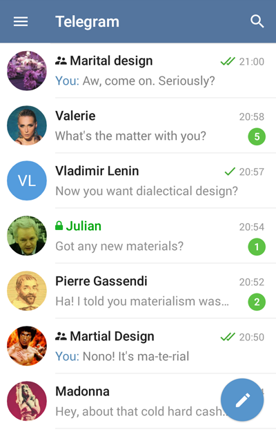 Here‘s what Telegram’s new material design looks like in motion on a Google Nexus phone, just to give you a taste of the animations: