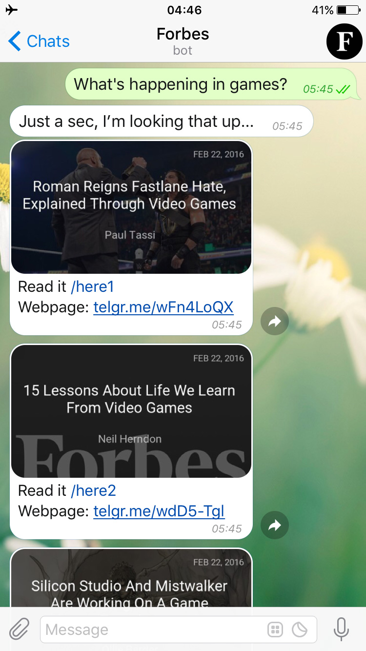 Many news organizations are building bots to provide tailored subscriptions. In this update we've made it easier to share the links, pictures and videos you get from bots. Check out the new official @forbesbot to see how this works.
