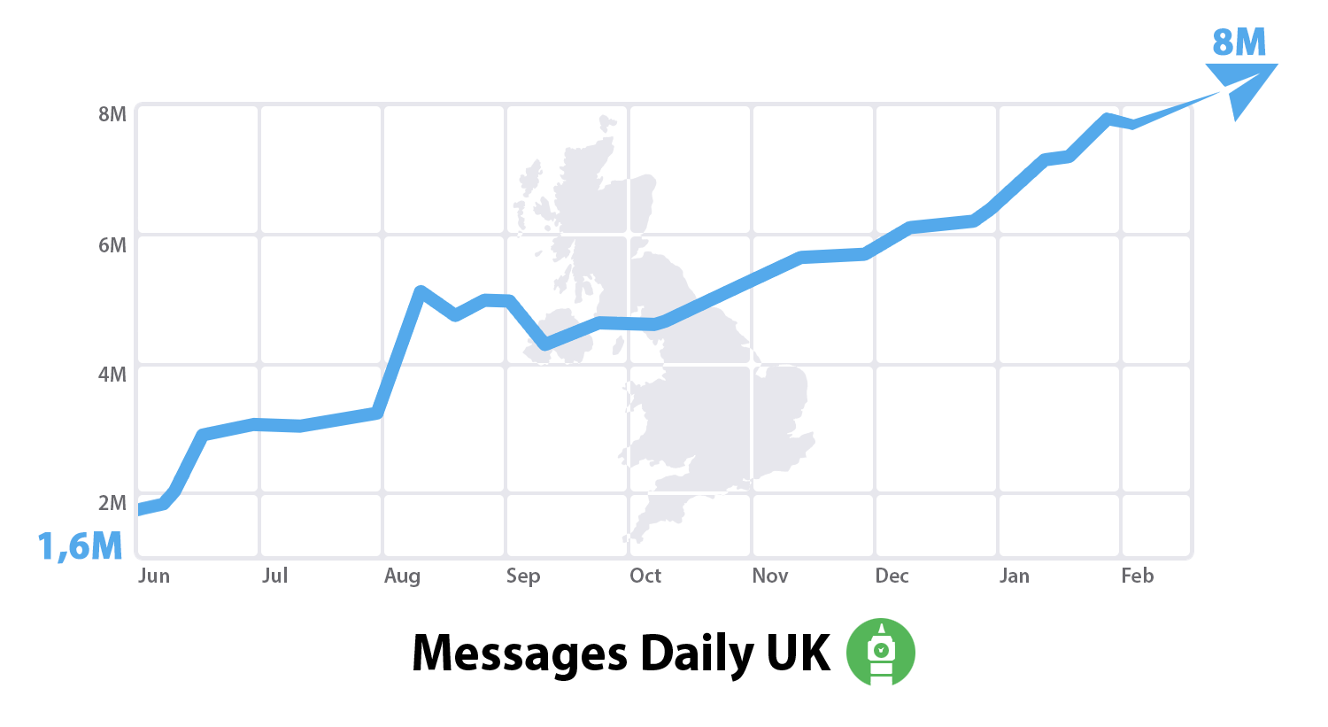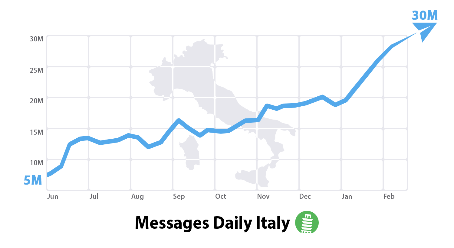 Here‘s what you’ve done: since June 2014 Telegram messages sent daily in the USA increased 8 times, the UK grew 5 times, Italy increased sixfold. Similar graphs can be drawn for more than 30 countries, from India to Turkey, from Malaysia to Chile.