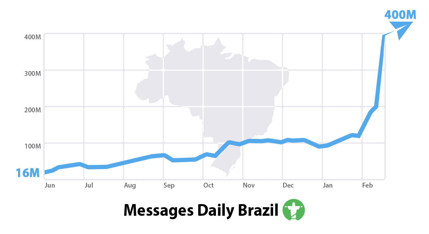 As for Brazil – the beautiful graph below is already out of date. 4,5 million Brazilians signed up for Telegram today and the day before. They will send on the order of 700 million messages today.